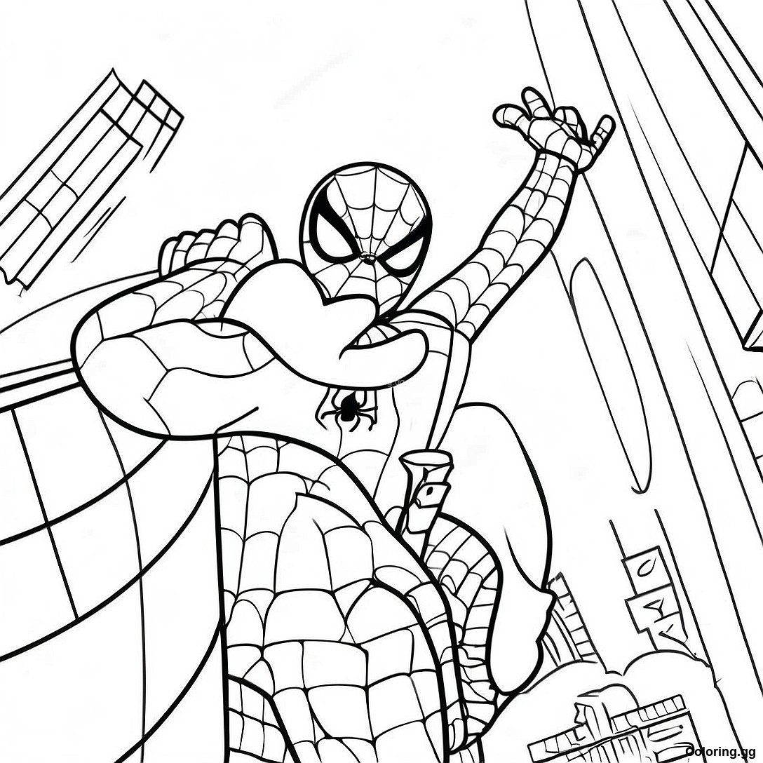 หน้าระบายสีสไปเดอร์แมน swinging ผ่านเมือง