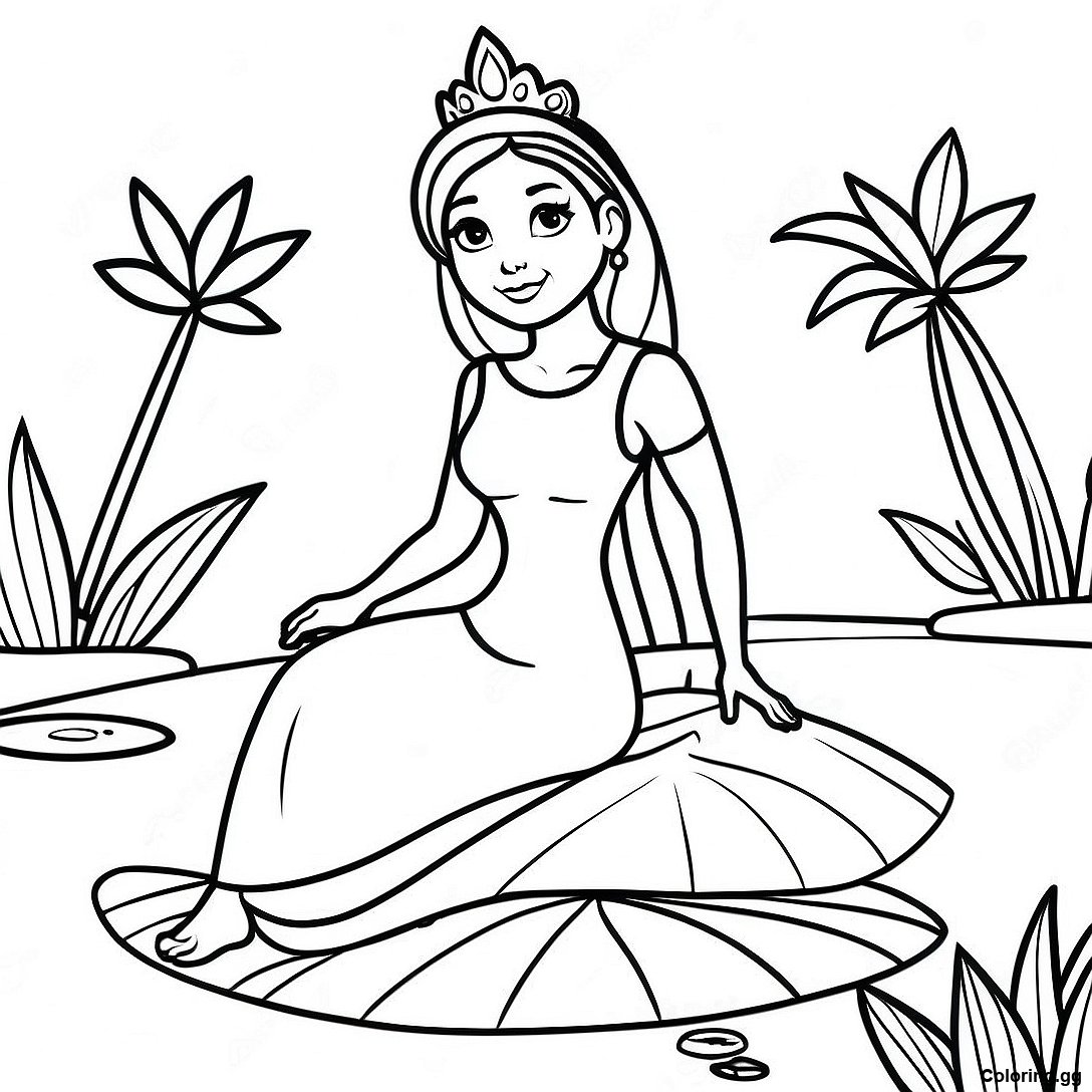 ดาวน์โหลด PDF ที่พิมพ์ได้ของ หน้ากระดาษระบายสีเจ้าหญิงราชวงศ์นั่งอยู่บนใบลิลลี่
