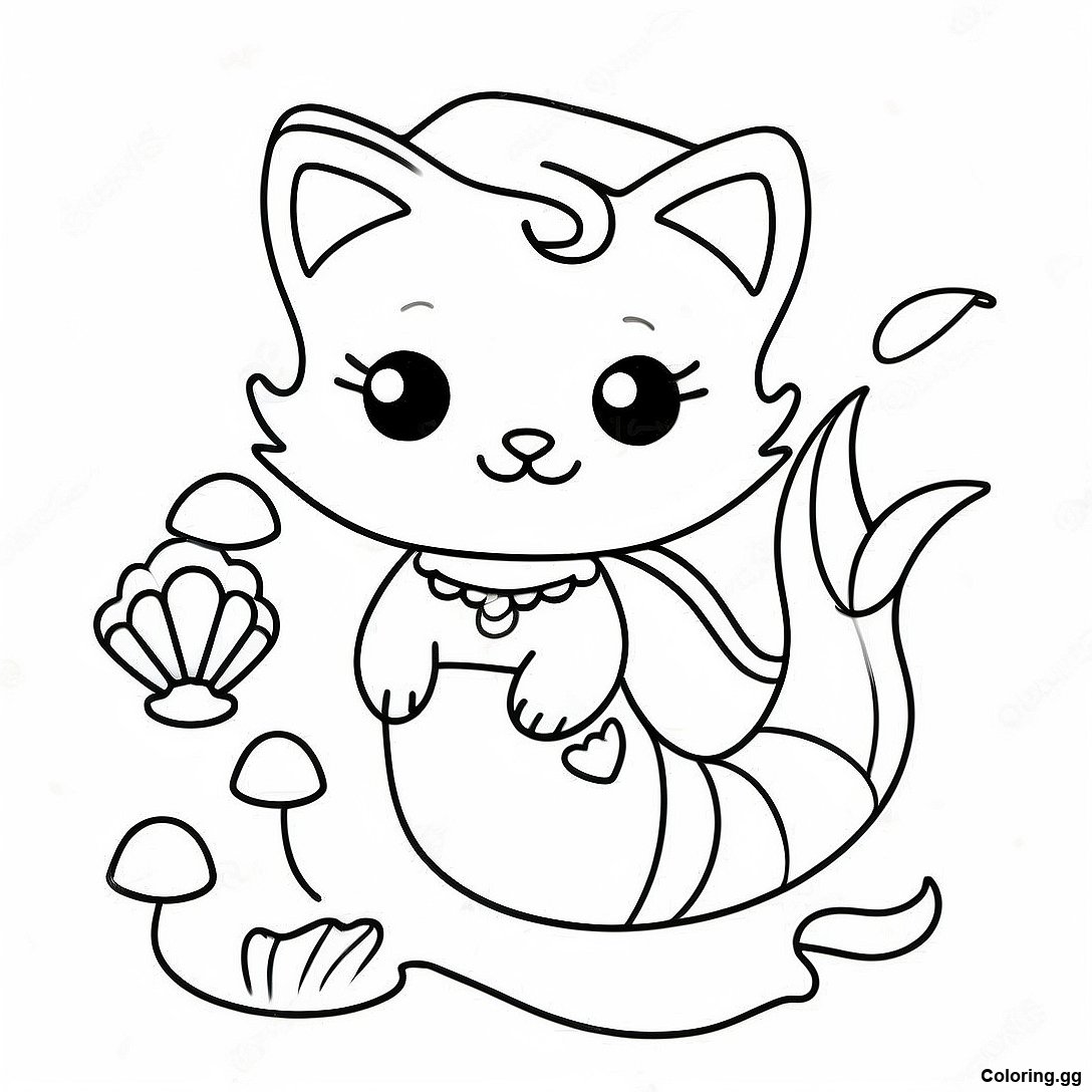 ดาวน์โหลด PDF ที่พิมพ์ได้ของ หน้าระบายสีแมวเงือกน่ารักกับเปลือกหอย